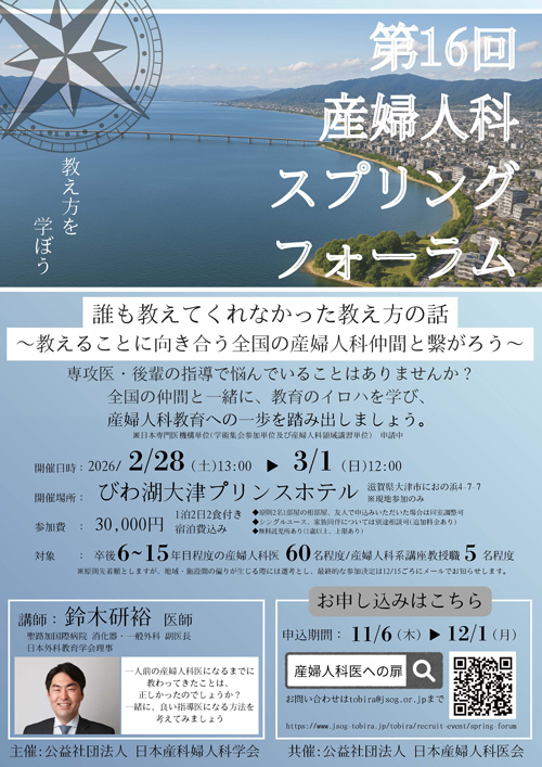 2026年2月28日(土)~3月1日(日)にわたり、第16回産婦人科スプリングフォーラムを開催いたします。本フォーラムは、若手産婦人科医が集まり、『未来の産婦人科を創る人材の育成』を目的に、様々なテーマに沿って議論や交流を行う企画です。今回のテーマは、「誰も教えてくれなかった教え方の話~教えることに向き合う全国の産婦人科仲間と繫がろう~」です。