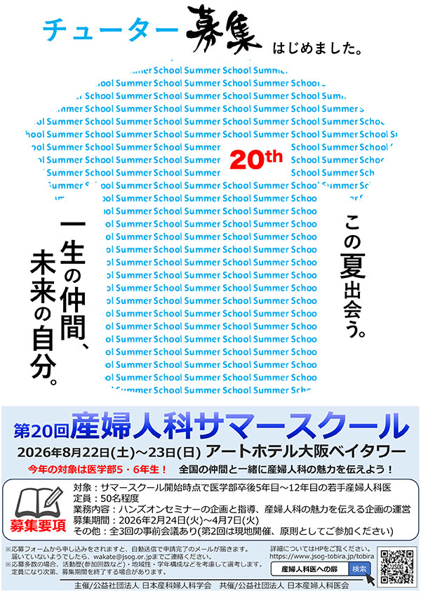 | ■企画概要 | 医学部5・6年生を対象としたハンズオンセミナーを行います。例年は、医学部5・6年生および臨床研修医1年目を対象としておりましたが、第20回となる本年より、対象を医学部5・6年生に限定することとなりました。2027年1月頃には、臨床研修医1年目の方々を対象としたイベントも予定しています。 実践的な実習や産婦人科医との相談会を通じて、産婦人科の魅力を伝えることを目的としています。参加者のみならず、チューター同士のつながりの構築や指導力の向上など、チューターの皆さまにとっても産婦人科人生を変える機会となることを目指しています。 熱意溢れるチューターの皆さまのご参加を心よりお待ちしています。 |