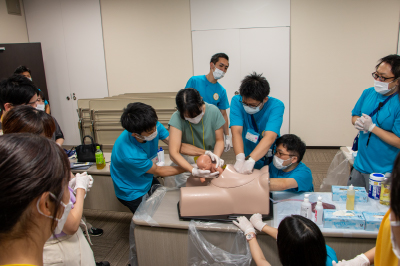 ドライボックスや縫合パッドを用いて、腹腔鏡の手技や縫合の基礎について参加者に体験してもらいました。腹腔鏡ブースでは、チューター対抗のタイムトライアルが開催されるなど、盛り上がりを見せました。